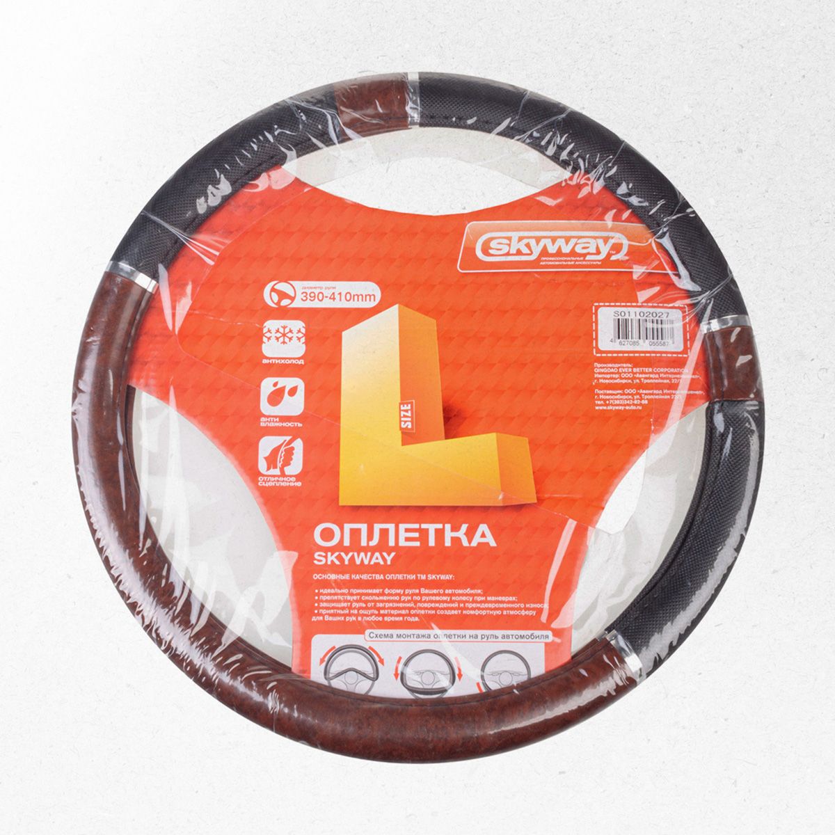 Оплётка руля SKYWAY кожаная Черно/Коричневая дерево, хром ECO (L) Skyway